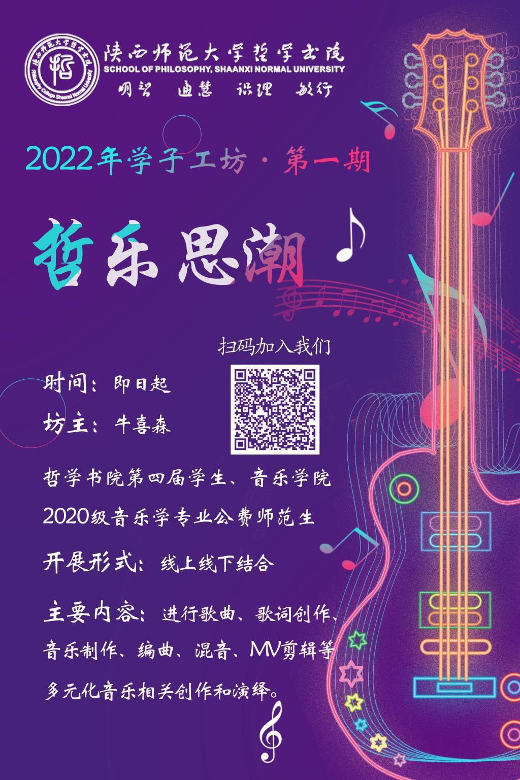哲乐思潮工坊旨在为同学们搭建完备良好的音乐交流平台,聚集一群热爱音乐、热爱创作的书院同学,营造轻松自由的互动氛围。在这里,大家可以组织乐队,也可以进行歌曲创作、歌词创作、音乐制作、编曲、混音、MV剪辑等多元化音乐、歌曲相关创作和演绎,书写正能量的歌曲,传播音乐的“真、善、美”,用青年人的朝气、热情、梦想谱写出一段段美妙的音乐。