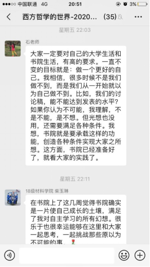第二组讨论于4月10日晚7点进行。韩智康同学从哲学上考量了机器人未来具有心灵的可行性,文中引述了阿西莫夫(Isaac Asimov)的描述;郑心怡同学认真研读了文献,探究了笛卡尔实体二元论中“我是”与“感官变化”的理论;周苗同学探究了塞尔以“中文屋”论证对强人工智能的反驳,以及徐英瑾的研究带给思想实验模型建构的教训,同学们从逻辑与前提上热烈讨论了这个问题;陈泓羽同学聚焦心脑关系,梳理了洛克与康德关于心灵的理论,并点出了自由意志,引发大家思考;最后,柴玉琳同学探讨了心灵存在何以可能和关于心灵我们能知道什么两个问题,并指出了“我思故我在”在后世的发展中经常偷换概念的逻辑问题。