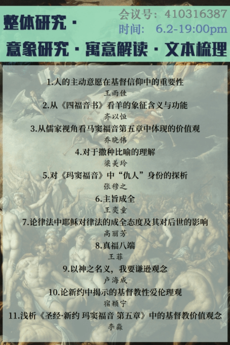 以“整体研究·意象研究·寓意解读·文本梳理”为主题的第四组讨论于6月2日晚顺利举行。讨论开始前,宗老师照例对主题文本的大致情况作了介绍,主要涉及《旧约》和《新约》的关联以及本次所讨论的文本的重要意义。她特别指出,基督信仰的价值观念在历史上改变了人们对待生命和弱势群体的态度,体现了其以“爱”的原则为核心的特质。应当尽量用科学的、客观的态度去解读和评价《圣经》,可以予以批驳,但即便如此,也应以敬畏的心态去对待。