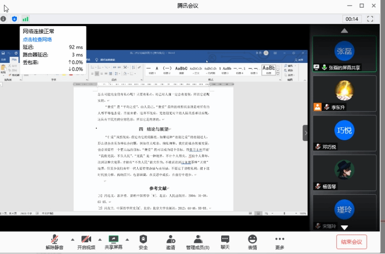 讨论课分为主题发言和提问讨论两个环节,每个环节针对每位同学的具体表现分开打分。每位同学按照顺序进行自己的主题发言,主题发言结束后由其他同学针对主题发言同学所讲内容进行提问或谈自己的认识。从本次讨论课的实际情况来看,所有同学都能精心准备自己的讨论稿,在设备允许的情况下,一些同学还屏幕共享了自己的Word、PPT文件。