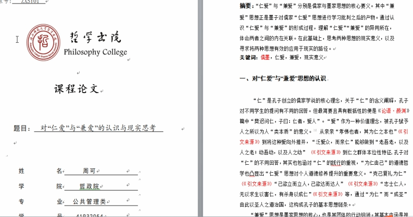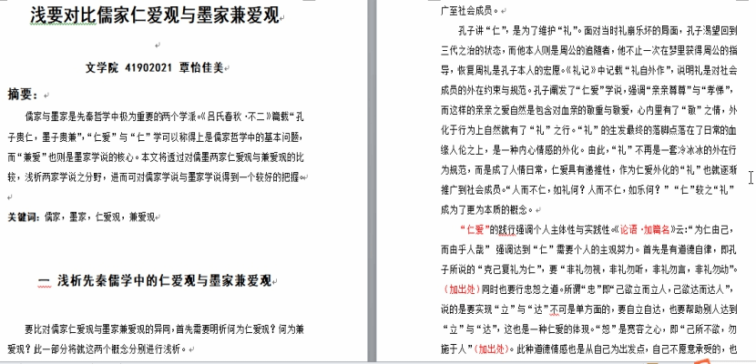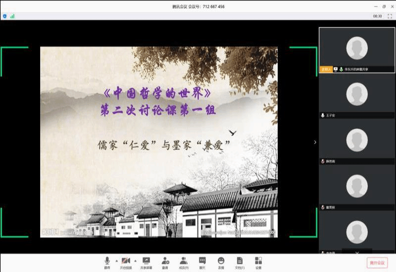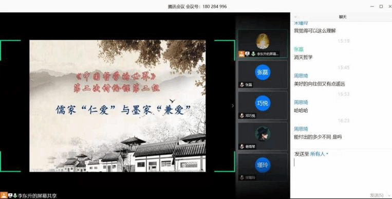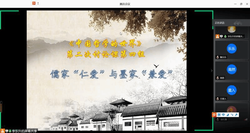 按照发言顺序,每位同学一次进行自己的讨论课主题发言。邓巧悦从考察儒家仁爱和墨家兼爱的思想内涵为出发点,探究儒家“仁爱”和墨家“兼爱”理论的建构逻辑,比较、分析仁爱和兼爱思想的异同之处及二者具有的历史价值。宋瑾玲认为儒家的“爱人”是在强调身份的前提之下,在每一个阶层内部“行仁”;墨家则认为爱的对象是所有人,他们之间享受“爱”的权利是同等的。樊力玮主要探讨儒墨两家对于“爱人”思想的异同,认为“爱人”是儒、墨两家均主张的思想,都是关乎天下的和平理想。而在各自的学说里,“仁爱”是有差等的,“兼爱”是无差等的。周可则提出“仁爱”与“兼爱”分别是儒家与墨家思想的核心要义,其中“兼爱”思想正是墨子对儒家“仁爱”思想进行学习批判之后的产物,通过认识“仁爱”与“兼爱”的形成过程,理解“仁爱”“兼爱”的异同所在,可以体会两者之间的内在关联。杨雪琴指出面对混乱的社会局面,孔子和墨子都提出了“爱人”的主张,以此来构建社会伦理秩序,二者在具有一定相似性的同时,也具有诸多差异,如伦理动机、爱人的顺序、爱人的手段等方面有所不同。张磊认为儒家“仁爱”与墨家“兼爱”分歧的最大原因在于孔子和墨子出身不同,所处的时代也不同,但二者以人为本的理念又使得他们具有相同点,且二者最终目的都是为了百姓安居,如今实现中华民族伟大复兴的重要节点已经到来,我们要重新审视“仁爱”与“兼爱”。周思琦提出孔子以仁为最高的道德, 墨子以兼爱为最高原则, 可以说都是宣扬人类之爱,但是仁爱中没有消磨阶级差异,讲究先亲而后外,于现代社会有些不妥;墨家讲究兼爱,强调了爱无差,但也有其局限。