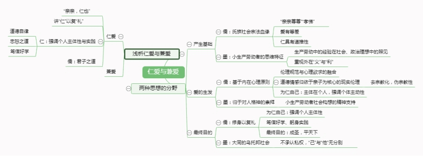 根据第三组制定好的发言顺序,每位同学依次进行了自己的主题发言。张熙怡提出墨家的“兼爱”与儒家的“仁爱”都围绕着人类之爱,都有一定的积极意义和局限性,墨家的爱理论上是一种无差等的爱,儒家强调的是有差等的爱,墨家与儒家两家关于如何实现爱的途径也存在差异。王至柔从两家学说或思考路径着手,由“爱”的视角看两者差异,分析儒墨两家“爱”的差别、归宿、演变、矛盾、本位、表述,并从“强调爱”、“为政建言”、“攻击异端”三个方面叙述了儒家墨家的相同之处。覃怡佳美为自己的主题发言制作了板书图片(见下图),她认为“孔子贵仁,墨子贵兼”,“仁爱”与“仁”学可以称得上是儒家哲学中的基本问题,而“兼爱”也则是墨家学说的核心,透过对儒墨两家仁爱观与兼爱观的比较,浅析两家学说之分野,进而可对儒家学说与墨家学说得到一个较好的把握。朱楚凡认为仁的主旨是“爱人”作为善而体现的仁,可仁是情境化的,不是死板不变的;墨家是想通过“兼以易别”的“兼爱”途径来消除那些“恶人贼人”的邪恶现象,而墨家兼爱则有着现实的无奈,并不是每个“侠墨”最后都会坚持着兼爱观。何丽伟则从对“天道”观入手,讲解了自己对于道家、儒家、墨家主要天道观思想的认识,并从天道入手考察了儒墨两家“爱”的异同。王亦清认为儒墨两家针对初秋战国时期礼坏乐崩、连年征战的社会现状而分别提出自己的政治理想,因此儒家“仁爱”与墨家“兼爱”两种哲学观点的范围区别并非是根本性的,而是有相通之处;但两者的具体内涵在阐发和证明的过程中,出现了不同的方式,“仁爱”与“兼爱”两种思想,在当今社会都有其积极价值。王雪凝认为面对社会秩序的破坏,儒墨两家分别提出了“仁爱”和“兼爱”作为救民治国的良方,二者皆提出以“爱人”治世,但二者的立足点、推衍顺序和特点又有所不同。赵智慧提出儒家的仁爱思想是一种自然思维,强调以血缘为纽带具有现实性;墨家的兼爱思想则是彻底地社会化的,要求人与人之间不分亲疏地彼此相爱相利,具有浓厚的理想主义色彩;不过儒家的仁爱思想和墨家的兼爱思想并非决然对立而是互相通达的。