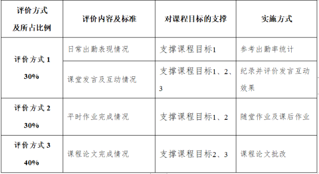 采用日常表现和课程论文考核相结合的办法(具体如下表)