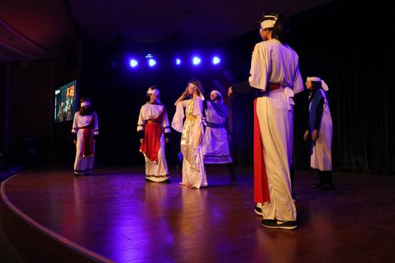 值得一提的是,本剧在传统话剧的对话表现之外,还将歌队和以“洞喻”为题材的舞蹈穿插其间。歌队是古希腊戏剧中特殊而又不可忽视的角色,它被亚里士多德列为悲剧六要素之一,主要作用为转换戏剧场面、引领剧情、引导观众感情等。本次排演亦遵照古希腊三大悲剧家之作品典范,敬奉亚里士多德之《诗术》教导,将歌队简化为朗诵形式予以呈现,朗诵内容化用、改编自阿里斯托芬、柏拉图、色诺芬、第欧根尼·拉尔修、席勒、歌德、荷尔德林、黑格尔、布克哈特、尼采、海德格尔等哲人、诗人的诸文本。同学们在充满神性和哲思的古典作品中感受到“人类此在在其根基上就是诗意的”,以及与先哲共同思考的震颤。