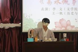 首先,在暖场节目中,来自历史与文化学院的王一帆同学和文学院的李文同学,身着典雅汉服,一人奏响悠悠古琴,一人手捧淡淡香茗,给大家带来一场名为《易水慨古》的古琴与茶艺表演,是一场极具中国特色的视觉盛宴;文学院的李悦同学演唱了一首自己的原创歌曲《当你出现》,羞涩中难掩瞩目才情;哲学与政府管理学院的黄阔和郑乙淇同学带来悦耳动听的吉他弹唱《那些花儿》;最后哲学与政府管理学院的彭方中、范思韵同学,文学院的何蔼晴、林嘉慧、韦艳丽同学以及化学化工学院的薛洁莹同学为大家带来了一场别致风趣的粤语朗诵《诗经·小雅·斯干》和《少年中国说》,以多姿多彩的方式淋漓尽致地呈现了书院浓郁的人文气息。