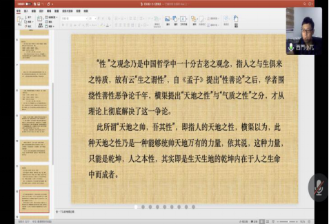 学生、文学院19级覃怡佳美同学担任主持,哲学与政府管理学院哲学系窦晨光老师主讲,书院办公室高洋老师以及“关中文化兴趣小组”、哲学专业等23位同学参与了本次线上分享活动。