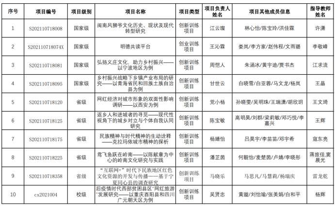猫耳fm 在本次立项中取得佳绩,共有10个团队获批立项,其中国家级4个,省级5个,校级1个。具体名单见下表: