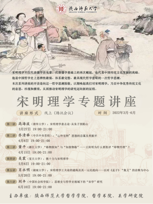 宋明理学不仅代表儒学在先秦、汉唐儒学基础上的再次崛起,也代表中国传统文化发展的高峰。他是中国哲学史上思辨性最强、体系最完整、最具现代哲学意味的一次哲学思潮。本次系列讲座的开设是向这一哲学思潮致敬,以期唤起我们对宋明理学,乃至中华优秀传统文化的省思、珍视和赓续,从而推动宋明理学的研究迈向新的征程。