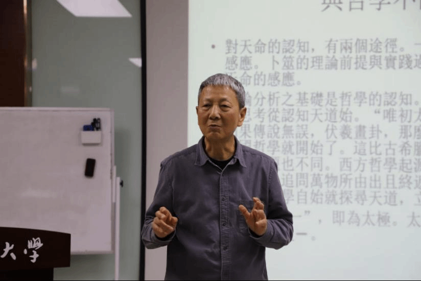 谢教授开题之前先谈了研究此类问题的因缘,在古稀之年由西学转向中国古代方向起因是几年前对宗教学方面的内容比较感兴趣,想补一些相关的课,于是开始具体的接触。在他看来,他所关注的问题是比较难以定性的,哲学、社会学、史学、经学一类词都无法概括,它只能是一个综合性的问题。而宗教问题,某种程度而言是我们当代最为核心的问题。谢教授说到此处,按下不表,留给同学们思考的空间,紧接着便进入了具体的文本分析。