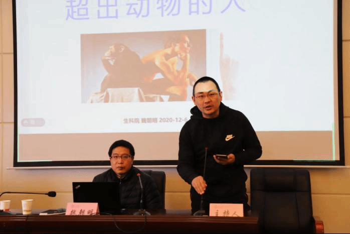 生命科学学院副教授魏朝明带来的“超出动物的人”,讲座由王辉老师主持,并通过“腾讯会议”全程直播,百余名听众通过线上线下参与了本次讲座。
