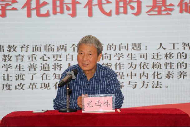 资深教授尤西林为基地做了首场报告——数字时代的基础教育,报告由师大附中副校长高丽文主持。