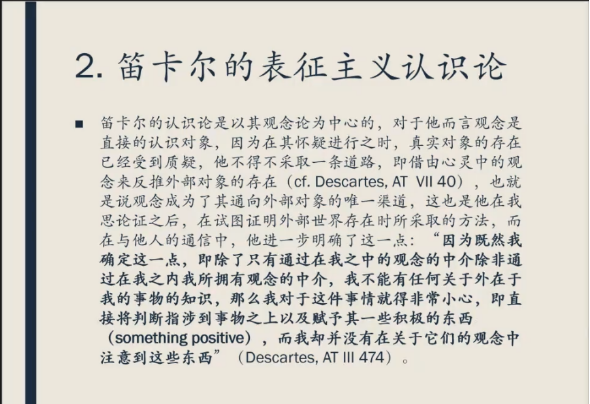 上述方案的争论核心在于:如何定义观念?在《第一哲学沉思集》的前言中,笛卡尔给出了关于观念的一个相对比较确定的解释,即视为思维动作的观念和视为思维内容的观念。之后,在第三沉思中进行细致讨论并承认其更多地是将重点放在观念作为心灵中的对象这一方面,而非作为思维动作。其次,关于观念的本体论地位问题。叶斌老师认为,在这方面,上述两种路径作了诸多尝试,但过度依赖于笛卡尔以外的理论进行解释,而忽略了他的文本给的答案。根据文本,笛卡尔将作为对象的观念(ideao)定义为真的与不变的本质。它可以在心灵中存在,也并不依赖于心灵,不能随意地被心灵影响。同时,对笛卡尔而言,这些心灵中的对象都是天赋的,它们属于心灵能力的一部分,本体论问题由此得以消解。通过文本,我们明确了观念的究竟所指,即它既不是外部对象的存在方式之一,也不是思维动作,相反,它主要指向的是心灵中的对象。而它所具有的中介性质,即笛卡尔所强调的,心灵必须借由观念来认知外部世界,也确认了以观念论为基础的认识论乃是一种表征主义。还存在第二个困境,也就是怀疑主义的挑战,即如果心灵必须借助于内在于其中的观念来实现对外部的认知,那么外部对象的存在在很大程度上是受到怀疑的。