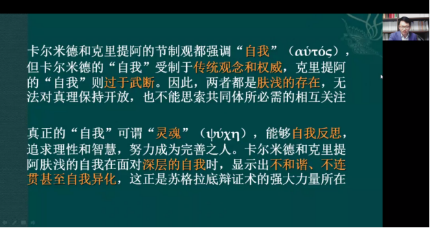 随后,林志猛老师讨论了节制和爱欲的关系。节制不是一种知识,而是一种存在的方式,是哲学化的方式,节制绝不应该低于知识,或比知识不确定,节制从自然角度理解是基于我们爱欲的本性,是知识这类东西存在的根基。因为人的所知和不知就是源于人的困惑,人的爱欲恰恰展示的也是人的匮乏,人之所以有爱欲,就是因为它缺乏。所以自我认识不再是知识的知识本身,也不是明确等同于苏格拉底的特殊智慧,如果把自我认识简化成关于自我,灵魂或心智的精致结构,而柏拉图认为,如果没有这个结构,自我被理解成爱欲的,不完整的,它就需要知道所知和不知,努力走向整全,借由爱欲来谈灵魂,去除了给自我强加的结构,保留了灵魂的动态特性。